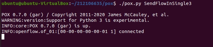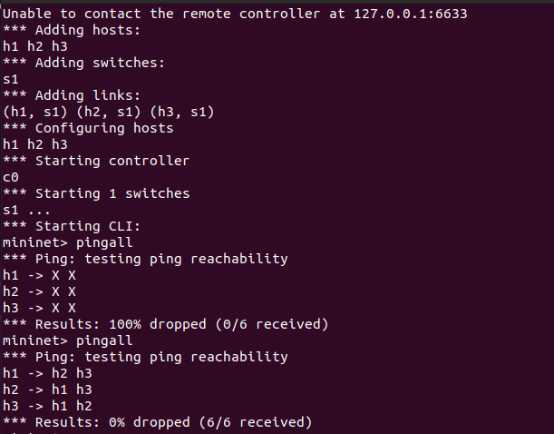 - 重新搭建(一)的拓扑,此时交换机内无流表规则,拓扑内主机互不相通;编写Python程序自定义一个POX模块SendFlowInSingle3,并且将拓扑连接至SendFlowInSingle3(默认端口6633),实现向s1发送流表规则使得所有主机两两互通。