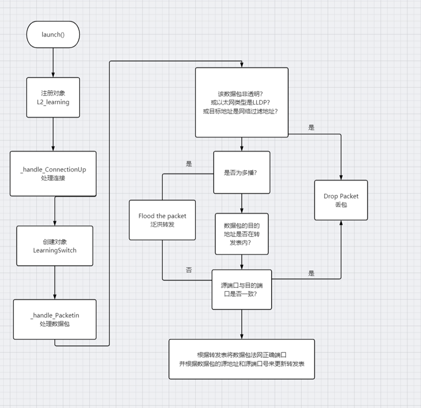 - 阅读L2_learning模块代码,画出程序流程图,使用 tcpdump 验证Switch模块。
