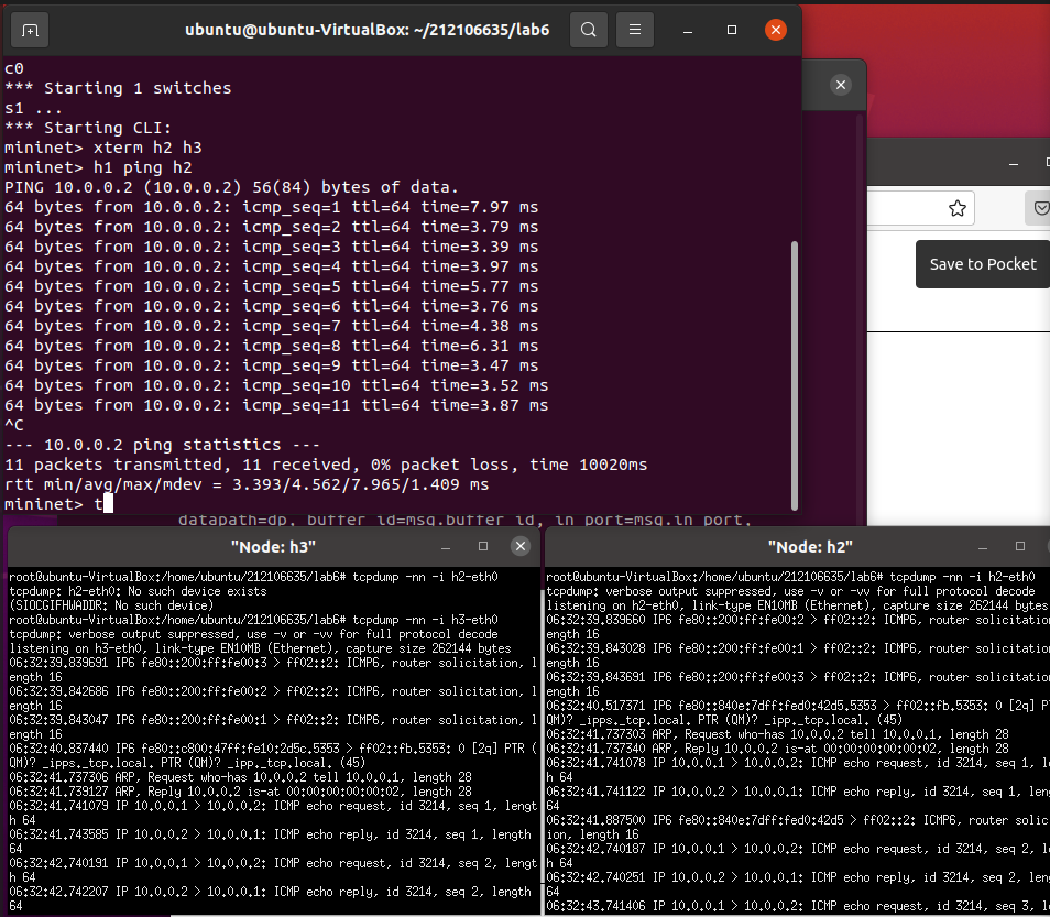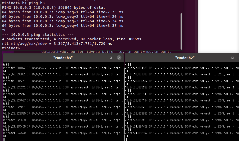 - 阅读Ryu文档的The First Application一节,运行当中的L2Switch,h1 ping h2或h3,在目标主机使用 tcpdump 验证L2Switch,分析L2Switch和POX的Hub模块有何不同