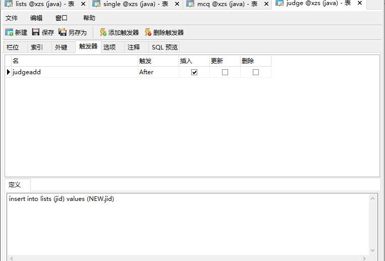 步骤2 :给single、mcq、judge几个表分别添加触发器(添加触发器的作用:在single、mcq、judge中添加数据时,也会在新表lists中同时添加数据)