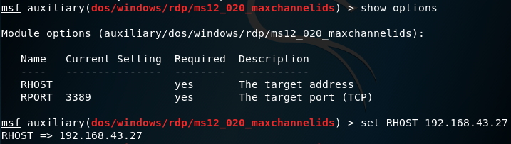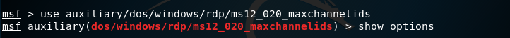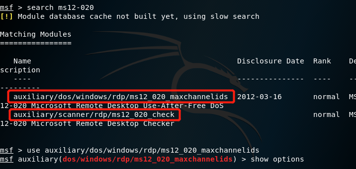 1、渗透测试系统中,在终端输入msfconsole进入msf终端,接着在msf终端中使用search功能搜索ms12-020,发现有两个可用模块: