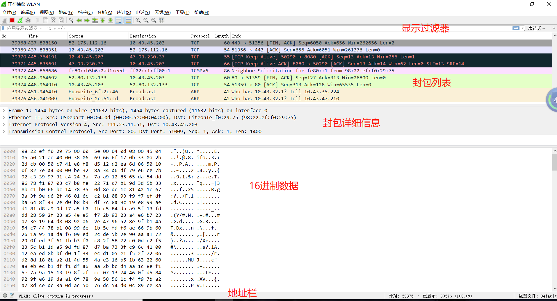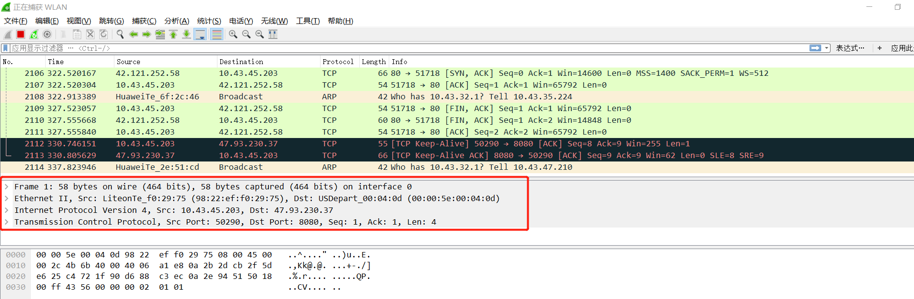 2. Packet List Pane(封包列表),显示捕获到的封包,有源地址和目标地址,端口号。 颜色不同,代表