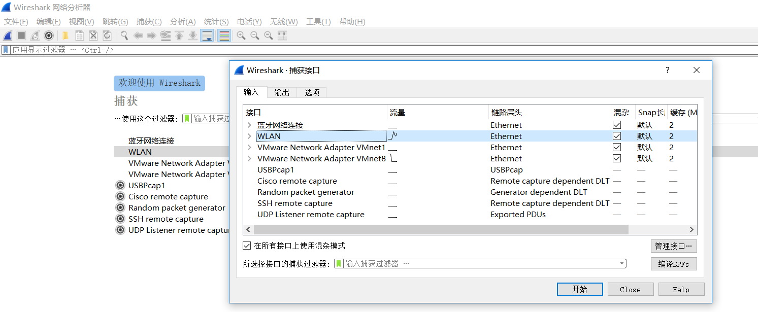 2.点击捕获->选项,出现下面对话框,选择正确的网卡,并设置混杂模式