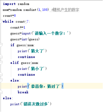 #100以内数字,输入大了,提示输入大了,输入小了,提示输入小了,总共7次机会,输入对了,结束循环