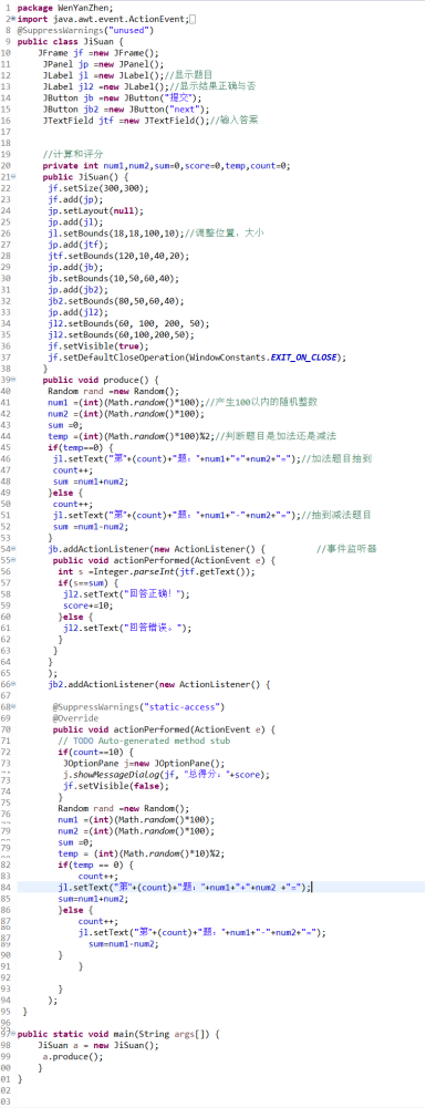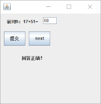 第一题,调用Math.Random()*100抽取100以内随机数并。进行加减运算,输入个人运算结果。得出总分。并且利用窗口和容器,进行主界面的输出。