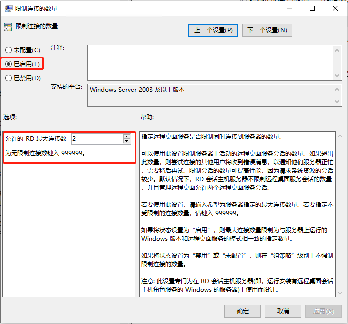 将限制连接的数量更改为启用并且填写允许的RD最大连接数