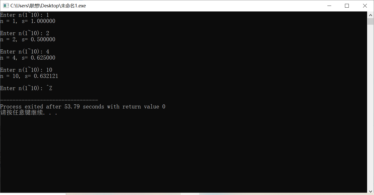 #include <stdio.h> double fun(int n); // 函数声明 int main() { int n; double s; printf("Enter n(1~10): "); while(scanf("%d", &n) != EOF) { s = fun(n); // 函数调用 printf("n = %d, s= %f\n\n", n, s); printf("Enter n(1~10): "); } return 0; } // 函数定义 double fun(int n){ double s=1,x=1; int i; if(n==1) return 1; else{ for(i=2;i<=n;i++){ x=-x*1/i; s=s+x; } return s; } }