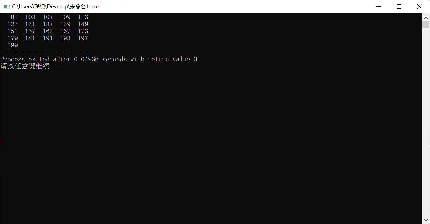 #include<stdio.h> #include<math.h> int isPrime(int n) ; int main(){ int i,s,a=0; for(i=101;i<=200;i++){ s=isPrime(i); if(s==i){ printf("%5d",s); a=a+1; } if(s!=0&&a%5==0) printf("\n"); } return 0; } int isPrime(int n){ int i,m; m=sqrt(n); for(i=2;i<=m;i++) if(n%i==0)break; if(i>m&&n>1) return n; else return 0; }