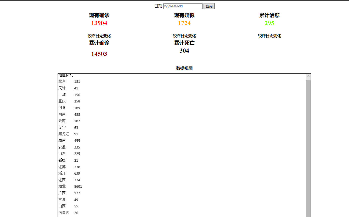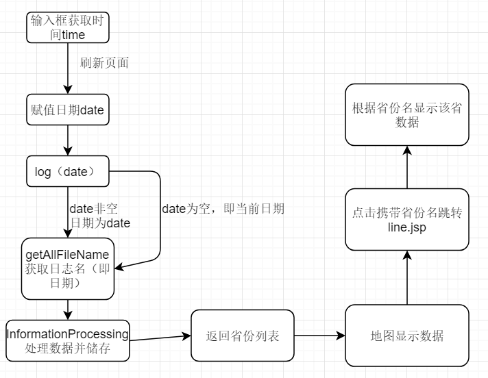 - 首先数据部分,我们没有采取网络爬虫去获取数据,而是用助教给的数据。因此只需要读取该日志即可获得数据。然后写一个province类储存省份信息,读取日志名即日期(做折线图有用),再一个个处理日志数据,将读取的数据存入province对象列表中。最后只要前端需要便直接将列表传过去即可。之后为了做具体省份的具体信息,再设一个可以返回province对象即可。