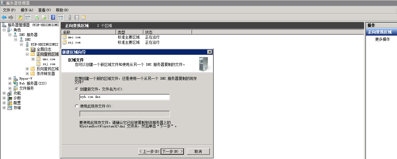 5、服务器管理器》角色》dns服务器》dns》正向查找区域,右键新建区域