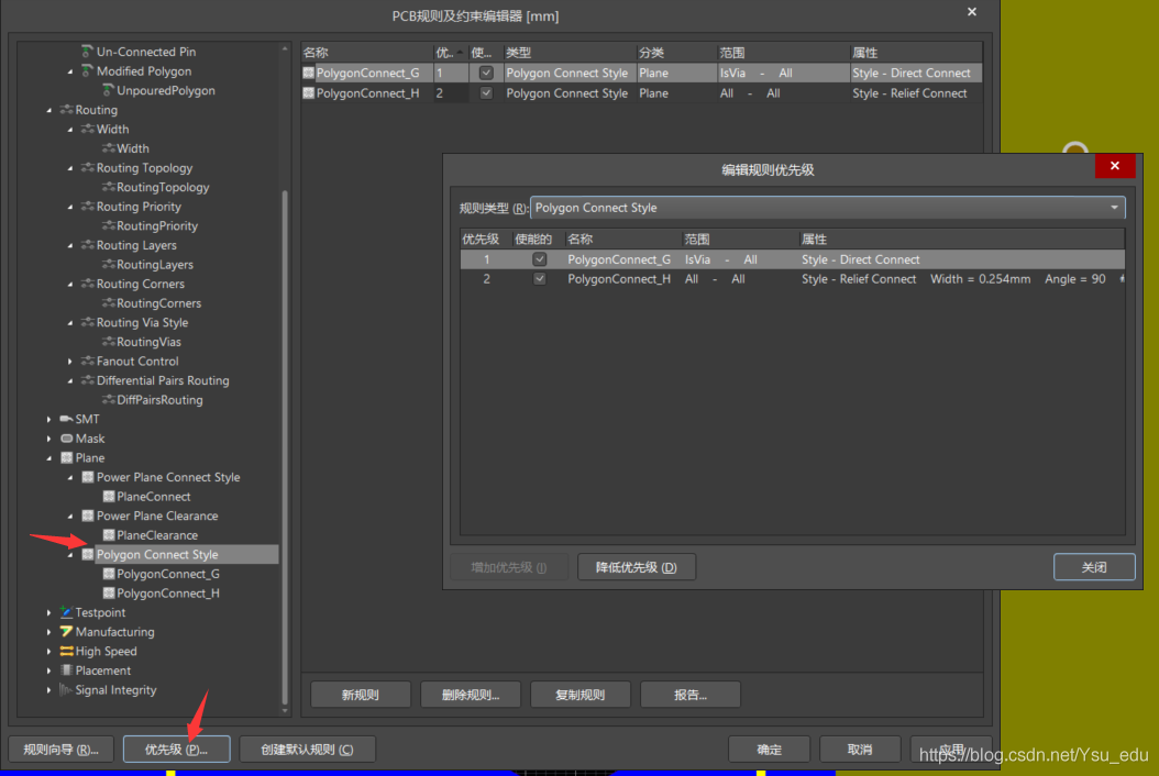 快捷键D+R打开设计规则界面 (设计 Degin→规则Rules)Plane→Polygon Connect Style新建一个规则,并将两个规则重命名,命名规则根据自己喜好,只要能让自己分得清就好。例如笔者设定PolygonConnect_H 对应为焊盘,PolygonConnect_G对应为过孔。