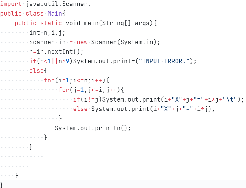 3.题目集第一次作业第三题是打印九九乘法表:基本要求是输入一个1-9的整数n,然后打印乘法表的前n行。