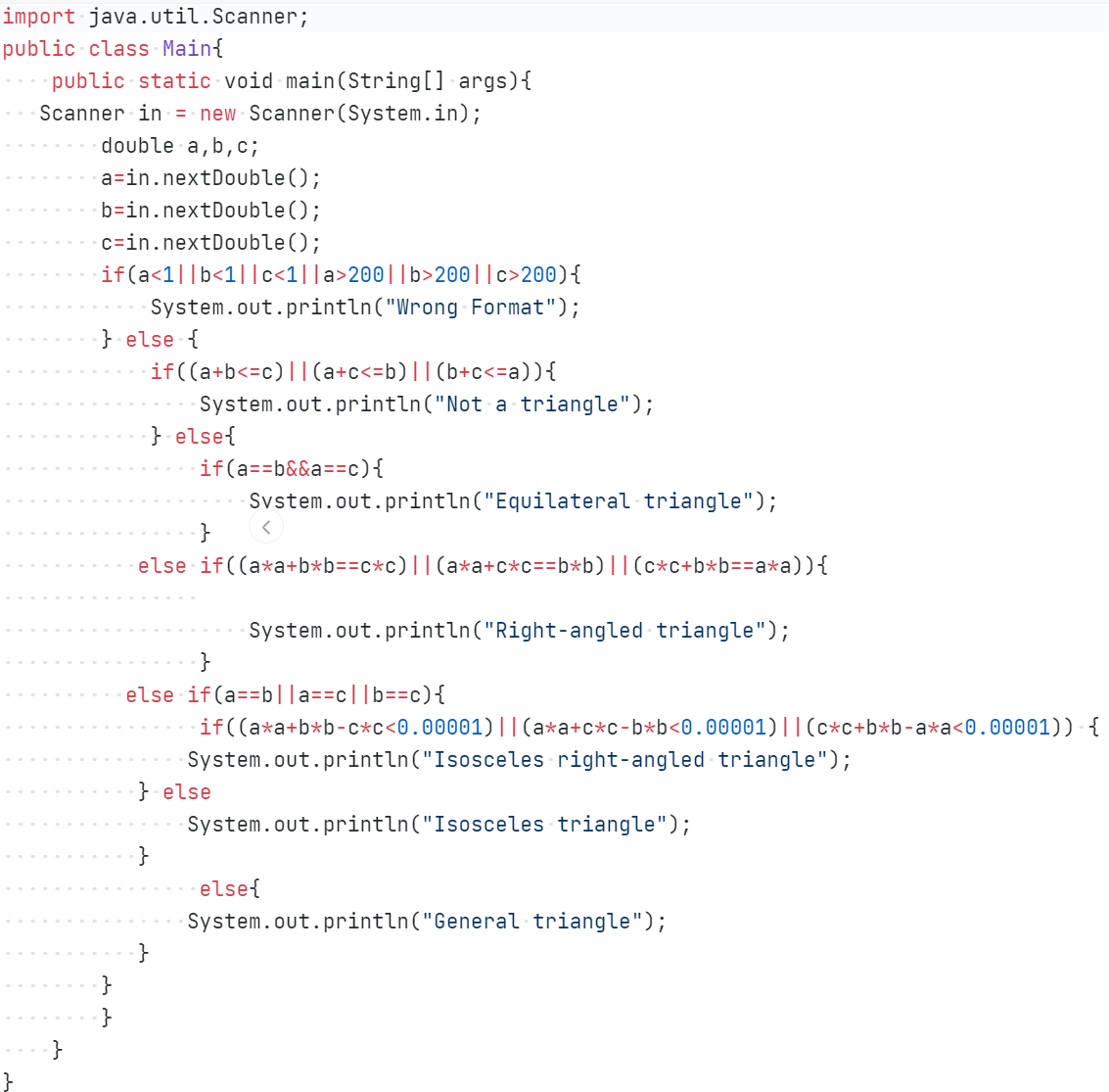 踩坑心得:在判断等腰直角三角形的时候,由于两条相等的直角边,第三边必定是一条根号边,但是由于不能输入根号,所以只能两条直角边的平方和减去第三条边的平方相差小于0.1就可以判断是等腰直角三角形。