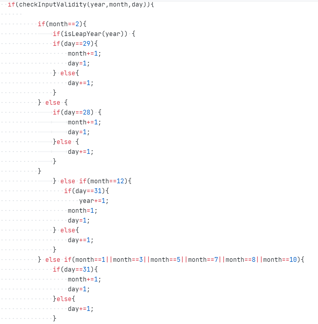 踩坑心得:用了许多if-else语句来分情况是否是闰年的时候来判定二月的天数是28天还是29天以及每个月份的不同天数,这种代码通常会被鉴定为垃圾代码,可以用数组来记录月份的天数和调用以至于代码不那么冗长和混乱。
