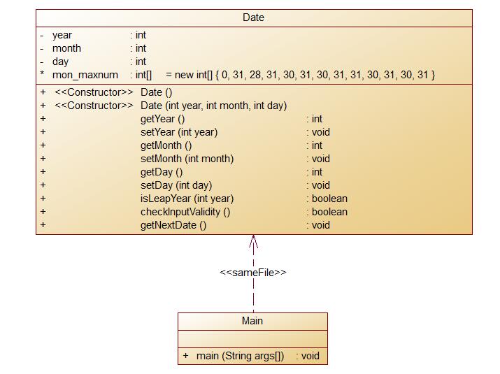 基本思路是先写出类的基本的属性以及getter、setter方法,然后写闰年的判断方法以及输入日期是否合法的方法,最后再写出求下一天的方法。