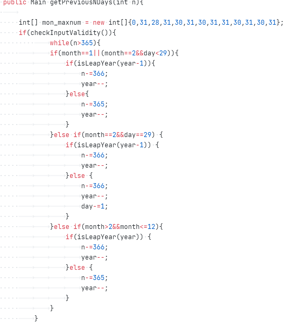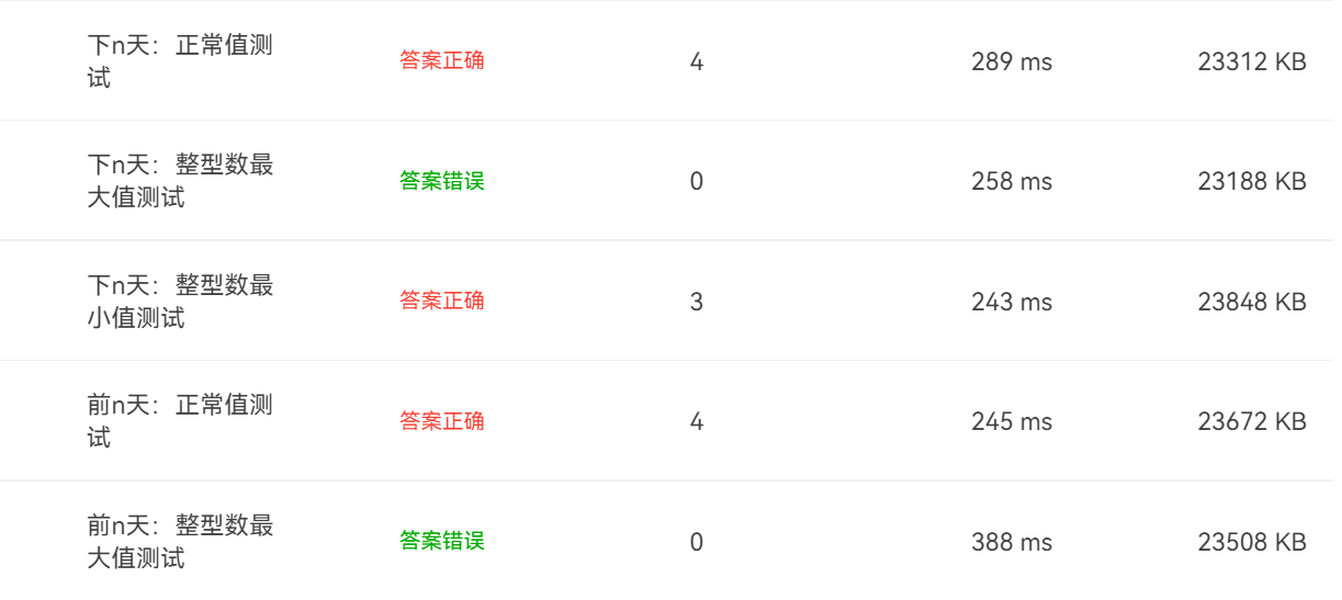 踩坑心得:在刚开始求下和前n天的时候我打算用while循环一个月一个月的加上去,写完之后提交测试我发现只过了正常值测试而边界值测试没有通过,然后我在想是不是可以再大一点一年一年加上去直到n小于365天的时候再用一个月一个月的加,这样可以减少很多的计算时间,提高效率。于是我在求下n天的时候就分了几种情况,如果n大于365天的话一种情况是一月到二月二十八号,输入的月份和日期在这个期间的话,需要判断这一年是否是闰年,是的话就加一年,n-366天,不是的话,加一年,n-365天,月份和日期不变;第二种情况则是输入的日期是二月二十九号,如果下一年是平年的话,加一年,n-365,月份要到三月的一号;第三种情况是三月到十二月,判断下一年是否是闰年,是的话就加一年,n-366天,不是的话,加一年,n-365天,月份和日期不变。求前n天和求下n天其实差不多,在求两个日期的相差天数的时候我直接采用了最朴素的做法,我先判断哪个日期前,然后给这个日期一天一天的加,统计加了多少天加到后面的那个日期。
