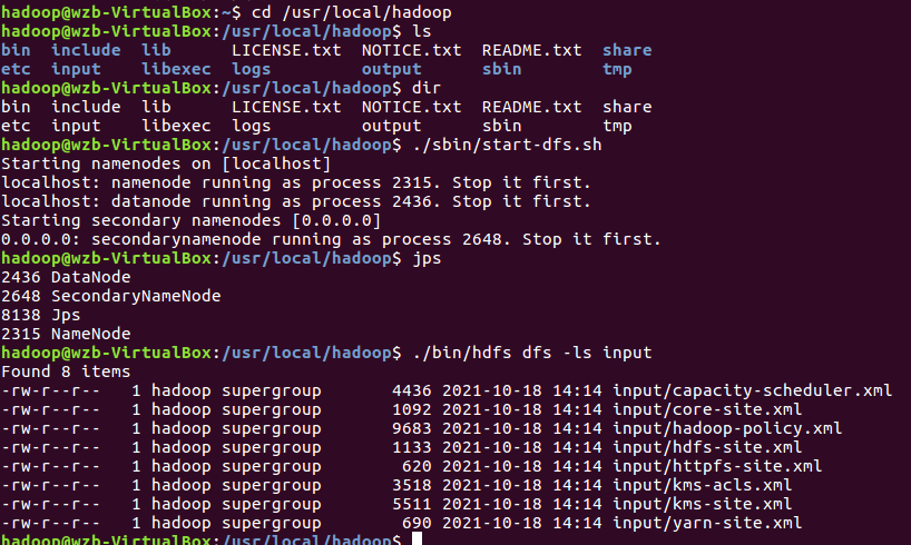 - 将hadoop的配置文件上传到hdfs上的input目录下。
