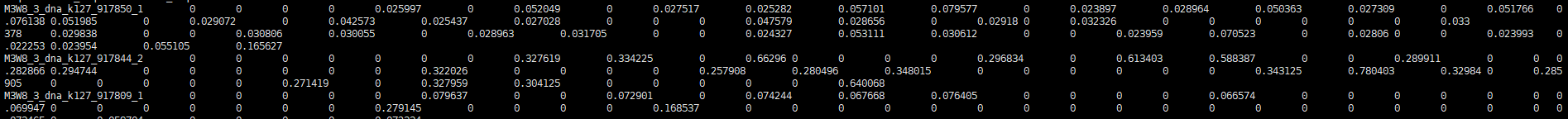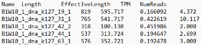 此外,这些结果告诉我们,在所观察到的样本中,每个转录本的表达水平不同。TPM和NumReads可以用于计算相对表达水平。例如,在该样本中,B1W10_1_dna_k127_31_1具有最高的TPM值(0.423),它可能是最强烈表达的转录本之一,同时该转录本也具有NumReads次高的读数(10.117)。另一方面,B1W10_1_dna_k127_42_2的TPM值较低(0.452),表示其表达水平可能相对较低,而其NumReads为2。