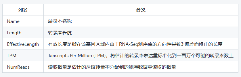 根据提供的信息可以发现,这是一个Salmon软件生成的转录本定量结果。为了更好地理解这些结果,请查看下表用于解释所列示的每个列的含义: