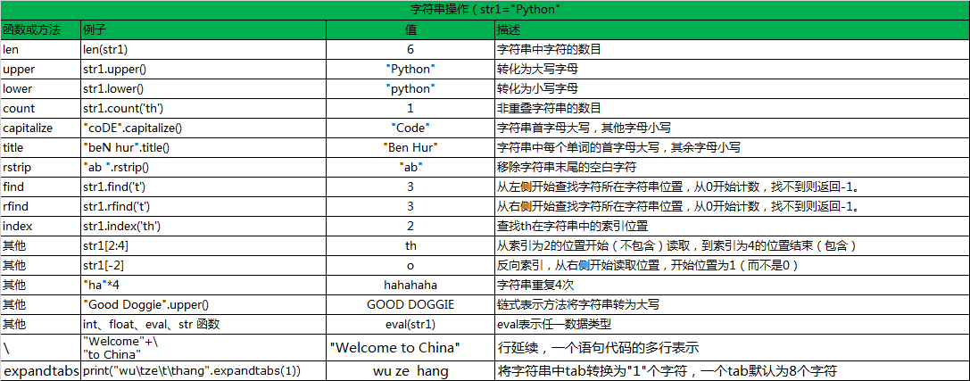 #基础部分 name='dRe吴am' print(name.capitalize()) #首字母大写 print(name.casefold())#大写全部变小写 print(name.center(50,"-"))#输出 '----------------------dReam-----------------------' print(name.count('ea')) #统计ea出现次数 print(name.encode())#将字符串编码成bytes格式"b'dRe\xe5\x90\xb4am'" print(name.endswith("am")) #判断字符串是否以am结尾 print("dRe\t吴am".expandtabs(10))#输出'dRe 吴am', 将\t转换成多长的空格 print(name.find('am'))#查找am,找到返回其索引, 找不到返回-1 name.index('a') #返回a所在字符串的索引 '9aA'.isalnum() #True '9'.isdigit() #是否整数 print(name.isnumeric()) print(name.isprintable()) print(name.isspace()) print(name.istitle()) print(name.isupper()) print("|".join(['alex','jack','rain'])) print('alex|jack|rain') # format和format_map msg = "1my name is {}, and age is {}" print(msg.format("Dream",21)) msg = "2my name is {1}, and age is {0}" print(msg.format("Dream",21)) msg = "3my name is {name}, and age is {age}" print(msg.format(age=21,name="Dream")) msg = "4my name is {name}, and age is {age}" print(msg.format_map({'name':'Dream','age':21})) #maketrans intab = "aeiou" #This is the string having actual characters. outtab = "12345" #This is the string having corresponding mapping character trantab = str.maketrans(intab, outtab) str = "this is string example....wow!!!" str.translate(trantab) print(intab) print(outtab) print(str) print(str.translate(trantab)) msg = "my name is {}, and age is {}" n4="Hello 2orld" print(msg.partition('is')) #输出('my name ', 'is', ' {}, and age is {}') print("Dream, chinese name is Memory".replace("ea","EA",1)) msg.swapcase #大小写互换 msg.zfill(40) '00000my name is {name}, and age is {age}' n4.ljust(40,"-")#'Hello 2orld-----------------------------' n4.rjust(40,"-")#'-----------------------------Hello 2orld' b="ddefdsdff_哈哈" b.isidentifier() #检测一段字符串可否被当作标志符,即是否符合变量命名规则