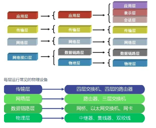 七层划分: 物理层,数据链路层,网络层,传输层,会话层,表示层,应用层