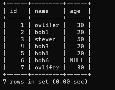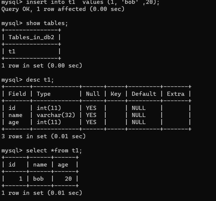 insert into t1 values (2, 'bob1' ,20),(3, 'bob2' ,20),(4,'bob3' ,20),(5, 'bob4' ,20);