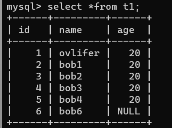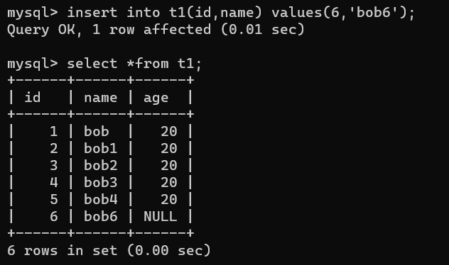 insert into t1(id,name) values(6,'bob6'); 空的没有指定 NULL填充