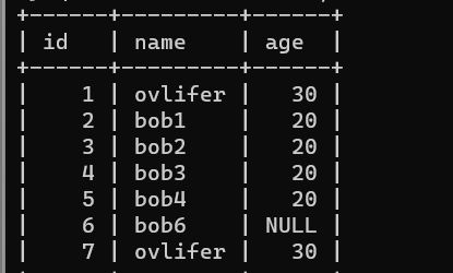 添加后 insert into t1 values(id,name) values(7,'ovlifer20');