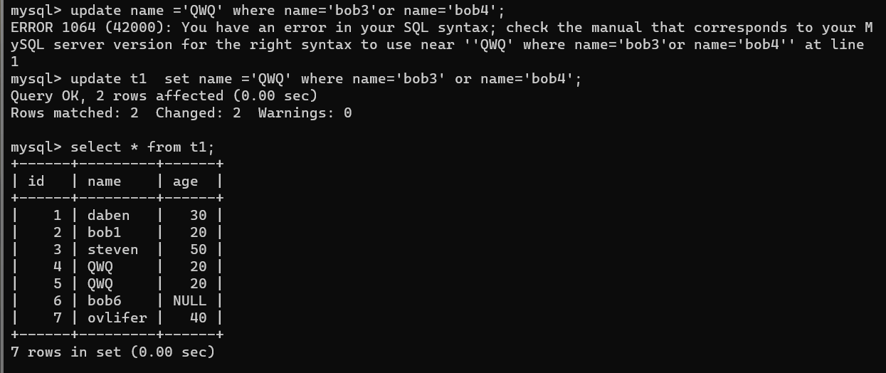 update t1 set name='QWQ' where name='bob3' or 'bob4'