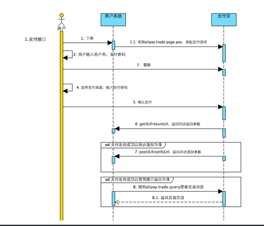 # 立即购买:使用支付宝支付 -1 我们系统充值[支付宝,微信]---》余额购买 -2 支付宝支付---》使用支付宝支付 -3 微信支付 # 介绍: -https://open.alipay.com/develop/manage 扫码登录 -网站支付:https://opendocs.alipay.com/open/270/105899 -手机网站支付:可以掉起支付宝app -咱们不会:输入账号密码支付 -https://opendocs.alipay.com/open/270/105898?pathHash=b3b2b667 -网站支付: -跳转到支付宝支付页面 -手机扫码付款 -在网页上输入支付宝账号密码付款 # 接入条件 -1 支付宝账号:个人和商户(需要用营业执照申请) -2 网站:备案过ICP ICP证浙B2-20160559 ---》没有 -国内:所有网站--》通过工信部审核--》上线运营 -域名:购买,按年付费 -云服务器:有公网ip--》所有人都能根据ip访问这个机器 -阿里云买的服务器-->协助你备案--》两周 -3 营业执照,且支付宝账号名称需与营业执照主体一致 # 公司里:公司专门有财务 -1 商户号 -2 私钥 -3 公钥 -4 支付宝公钥 # 费率 0.6% # 开发: https://opendocs.alipay.com/open/270/01didh?ref=api # 支付流程 用户在我们网站前端---》点下单,立即购买---》向我们后端发起请求---》我们后端要请求支付宝--》支付宝返回给我们一个支付链接---》我们把链接返回给前端---》前端打开链接----》进入支付宝页面---》登录--》付款---》付款成功---》支付宝会两个回调:get post --->咱们后端接收到post回调后-->修改订单状态 # 关于回调 -用户付款成功,支付宝会有个回调 -get:调用前端---》给用户看 -post:调用后端--》修改订单状态的--》异步通知说明 -对于 PC 网站支付的交易,在用户支付完成之后,支付宝会根据 API 中商家传入的 notify_url,通过 POST 请求的形式将支付结果作为参数通知到商家系统。 -在进行异步通知交互时,如果支付宝收到的应答不是 success ,支付宝会认为通知失败,会通过一定的策略定期重新发起通知。通知的间隔频率为:4m、10m、10m、1h、2h、6h、15h。 # 我们现在申请不了商户---》开发测试只能用沙箱环境--》后期公司里申请了商户号后 -只需要修改:商户号,公钥,私钥即可 # 沙箱环境:测试环境---》数据都假的--》流程跟正常一样 -https://open.alipay.com/develop/sandbox/app?is_switch_sandbox=true