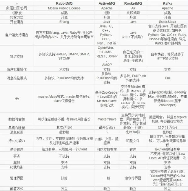 Kafka在于分布式架构,RabbitMQ基于AMQP协议来实现,RocketMQ/思路来源于kafka,改成了主从结构,在事务性可靠性方面做了优化。 广泛来说,电商、金融等对事务性要求很高的,可以考虑RabbitMQ和RocketMQ, 对性能要求高的可考虑Kafka