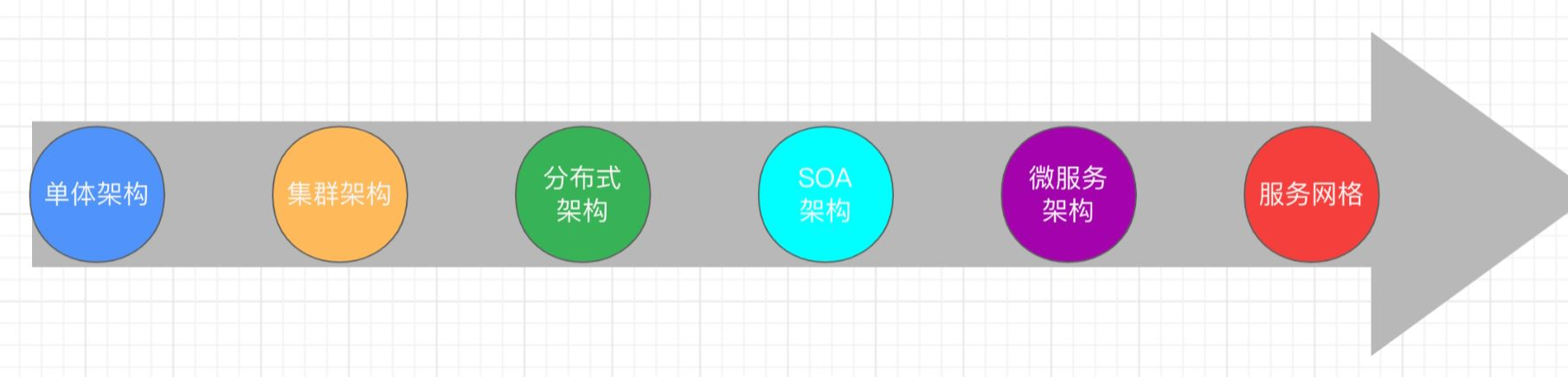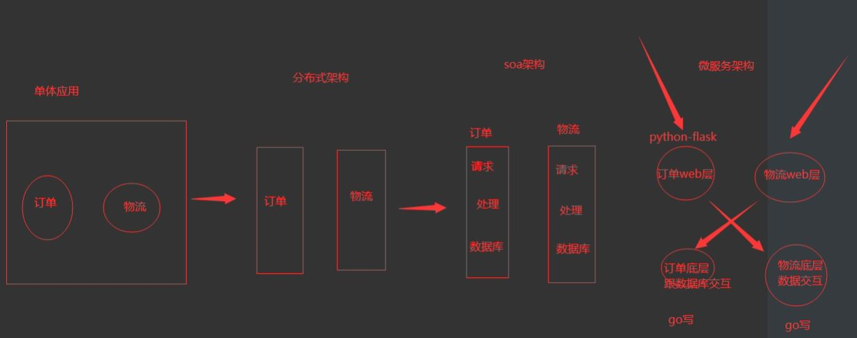 # 单体架构 -所有功能集成到一个项目中---》大单体 -单体架构---》集群化部署 # 集群机构 -单体应用--》部署在多台机器上---》组成机器 -nginx 转发 # 分布式架构 -电商: 支付 物流 订单---》三个项目 分布式服务顾名思义服务是分散部署在不同的机器上的,一个服务可能负责几个功能,是一种面向SOA架构的,服务之间也是通过rpc来交互或者是webservice来交互的 # SOA(分布式架构) # 微服务架构 (分布式架构)
