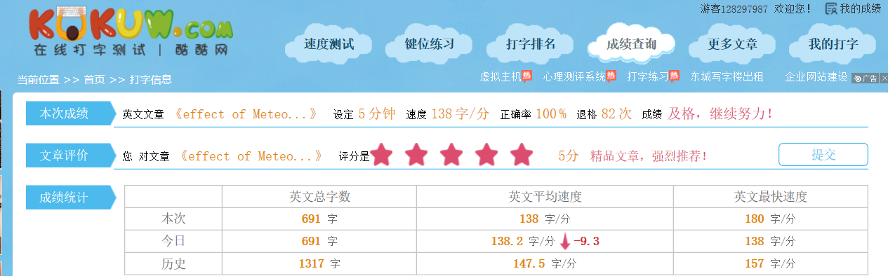 推荐使用在线打字测试这款软件练习打字,它方便快捷无需下载,下面是我使用这款软件打字获得的成绩: