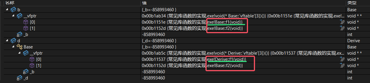 - 基类b对象和派生类d对象虚表是不一样的,这里我们发现