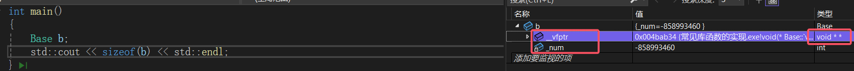 答案是8个字节。成员变量不是只有一个int类型的吗?为什么是8个字节而不是4个字节呢?那是因为在Base类中,除了本身的int类型的变量外,还会有一个指针,这个指针指向虚函数表,虚函数表内存放的是虚函数的地址。这个指针叫虚函数表指针,这个表简称虚表。(注意和虚基表区分)