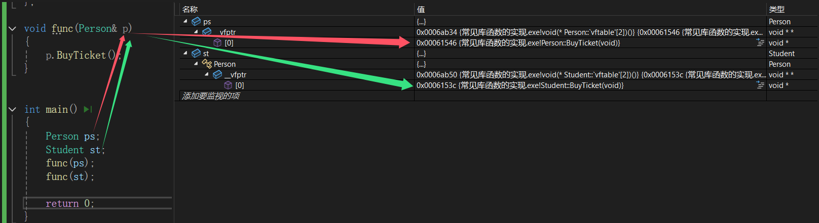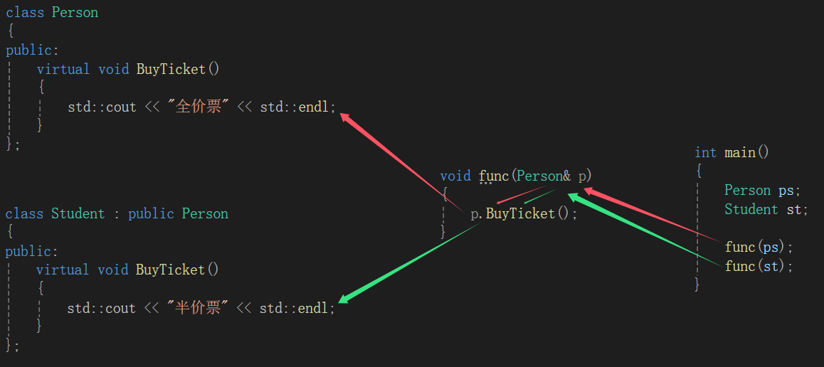 class Person { public: virtual void BuyTicket() { std::cout << "全价票" << std::endl; } }; class Student : public Person { public: virtual void BuyTicket() override { std::cout << "半价票" << std::endl; } }; -