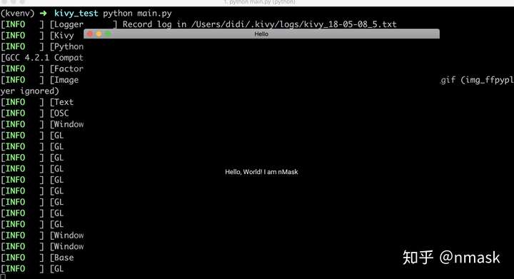 $python Python 2.7.10 (default, Jul 15 2017, 17:16:57) [GCC 4.2.1 Compatible Apple LLVM 9.0.0 (clang-900.0.31)] on darwin Type "help", "copyright", "credits" or "license" for more information. >>> >>> import kivy [INFO ] [Logger ] Record log in /Users/didi/.kivy/logs/kivy_18-05-08_4.txt [INFO ] [Kivy ] v1.10.1.dev0, git-5f6c66e, 20180507 [INFO ] [Python ] v2.7.10 (default, Jul 15 2017, 17:16:57) [GCC 4.2.1 Compatible Apple LLVM 9.0.0 (clang-900.0.31)]