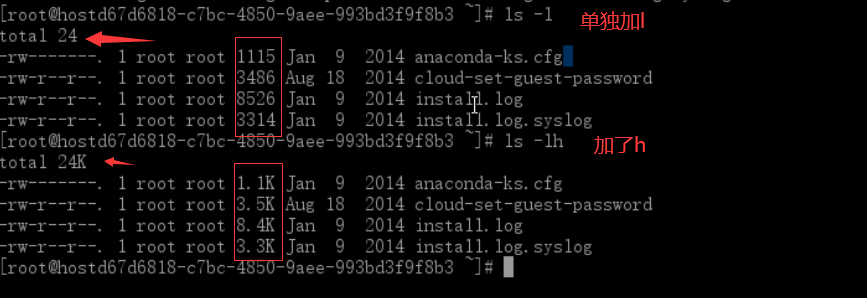 ls -h:可以看出更多的文件参数,通常和-l 一起