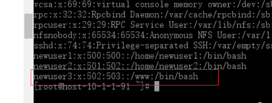 1.4 创建一个新用户newuser3,指定登录目录为/www,不创建自家用户目录(-M)