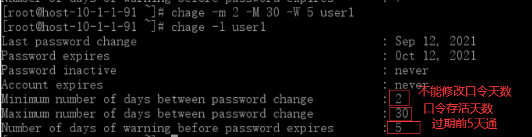 例如:要求用户user1两天内不能更改口令(-m 2)