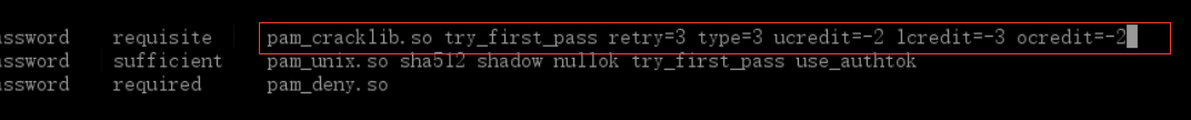在其后追加如下参数: ucredit=-2 lcredit=-3 dcredit=-3 ocredit=-2
