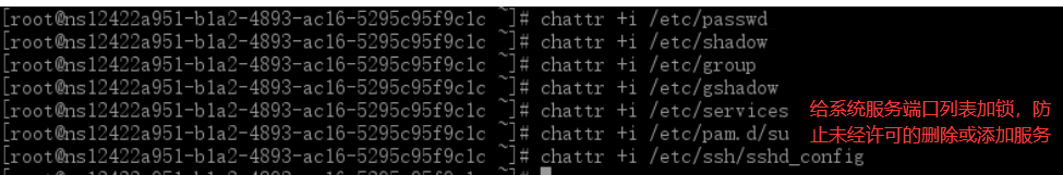 注意:执行以上 chattr 权限修改之后,就无法添加删除用户了,如果修改不了上面设置过的文件,记得取消只读权限chattr -i。
