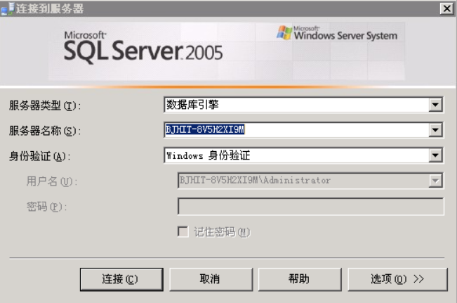 在桌面上单击“开始”,选择“程序”→“Microsoft SQL Server 2005” →“SQL Server Management Studio”,出现“连接到服务器”对话框,使用windows身份验证链接服务器
