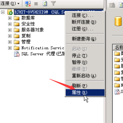在“对象资源管理器”中,右击服务器,然后单击“属性”。如果“对象资源管理器”不可见,则选择“视图”菜单上的“对象资源管理器”。