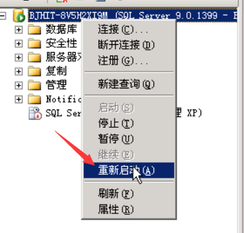 在“对象资源管理器”中,右击服务器,然后单击“重新启动”。