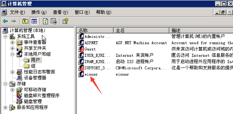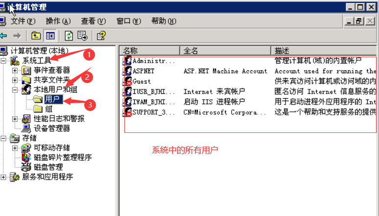 回到桌面,右击我的电脑,点击管理, 然后一次展开系统工具-本地用户和组-用户,此时在右边可以看到当前系统中所有的用户