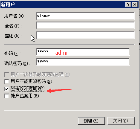 添加一个用户Winuer,并给该用户设置一个密码,本实验使用的密码是admin,密码可随意设置,但是需要记住,在后面需要用到,把用户下次登录时须更改密码前面的勾选去掉,把密码永不过期的选项选上,然后点击创建