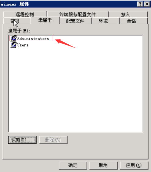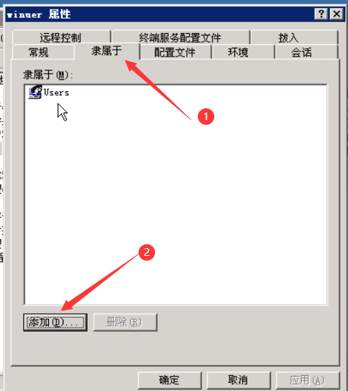 然后右击该用户,选择属性,点击隶属于选项卡,然后点击左下角的添加按钮。