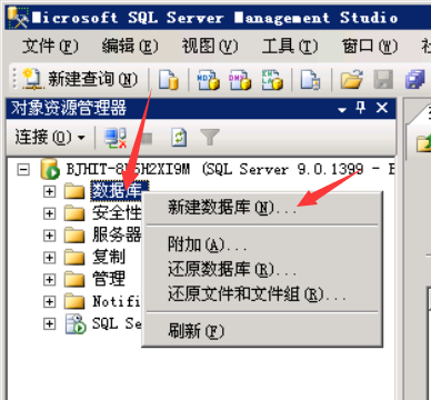 之后在SQL Server Management Studio中,右击数据库,选择新建数据库