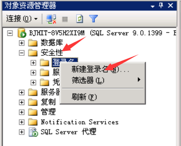 展开实例下的“安全性”,右击“登录名”按钮,在弹出的快捷菜单中选择“新建登录”。
